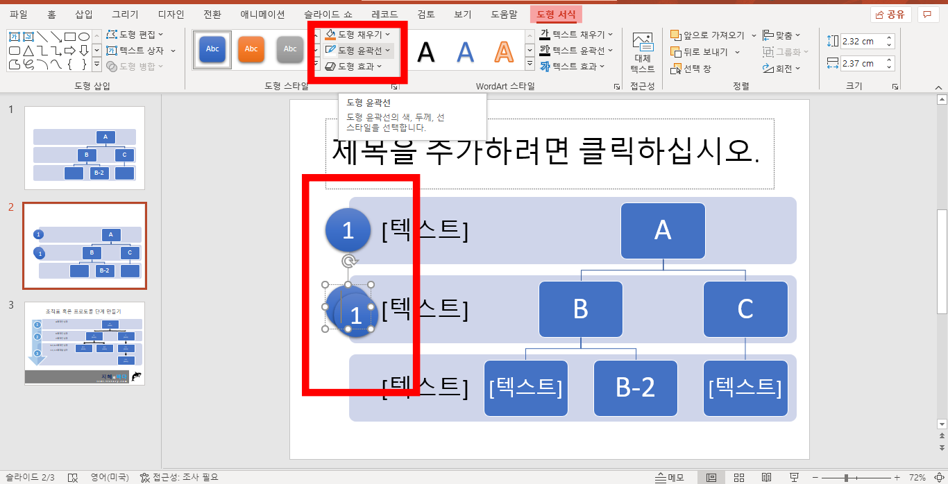 저의 경우 원의 도형에 숫자를 넣고 싶었습니다. 그리고 도형에 효과들을 주고 싶었죠. 도형 채우기, 도형 윤관선, 도형 효과 등등 이곳을 통해서 쉽게 도형을 입체적으로 만들 수 있습니다.