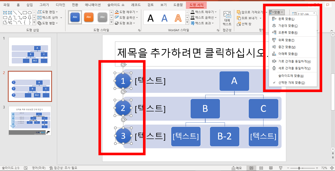 도형 서식 메뉴에 있는 맞춤 기능을 활용하시면 됩니다. 가운데 맞춤을 하면 선택한 숫자의 가운데로 딱 정렬하죠... 그리고 세로 간격을 동일하게 하면 1~3번을 기준으로 숫자 2번이 딱 자기 자리를 찾아 가게 됩니다.