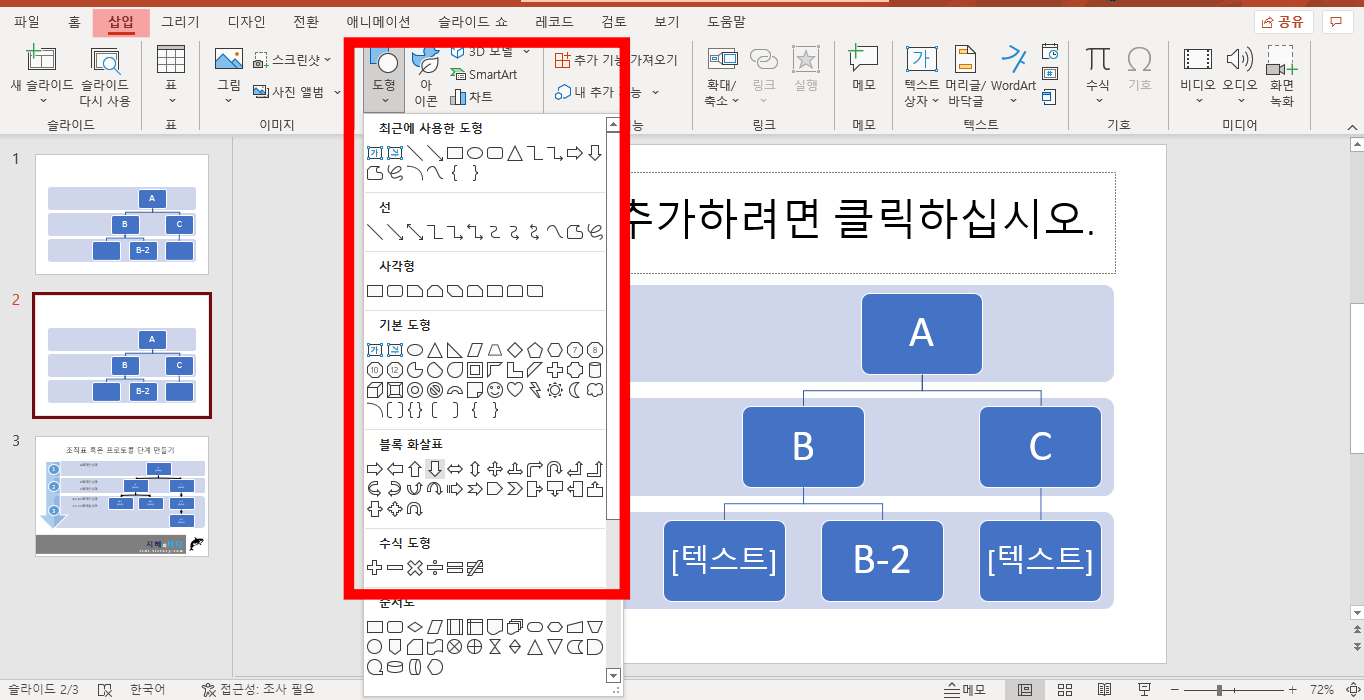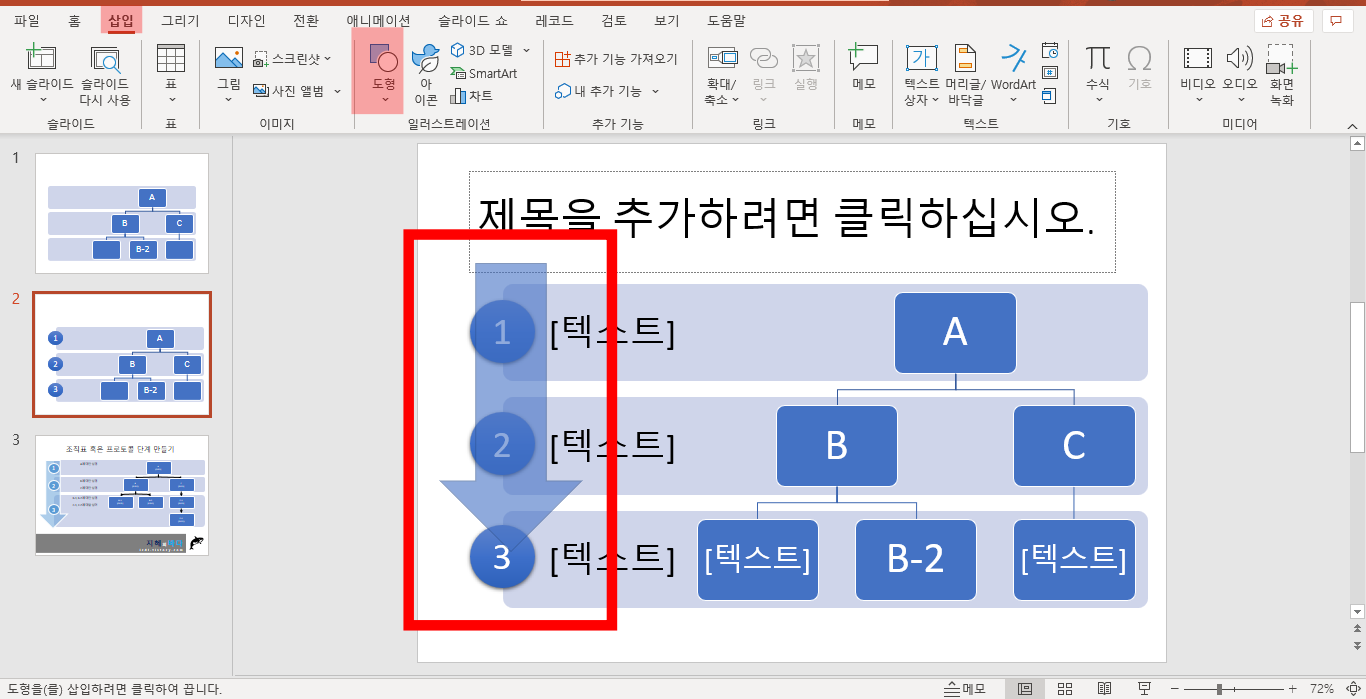 만들다 보면 제공되는 도형 보다 당연히 더 추가해야 할 일들이 있습니다. 그럼 도형 추가를 하시면 됩니다. 수준 올리기와 수준 내리기를 활용하시면서 도형의 적절한 위치에 놓으시면 됩니다.