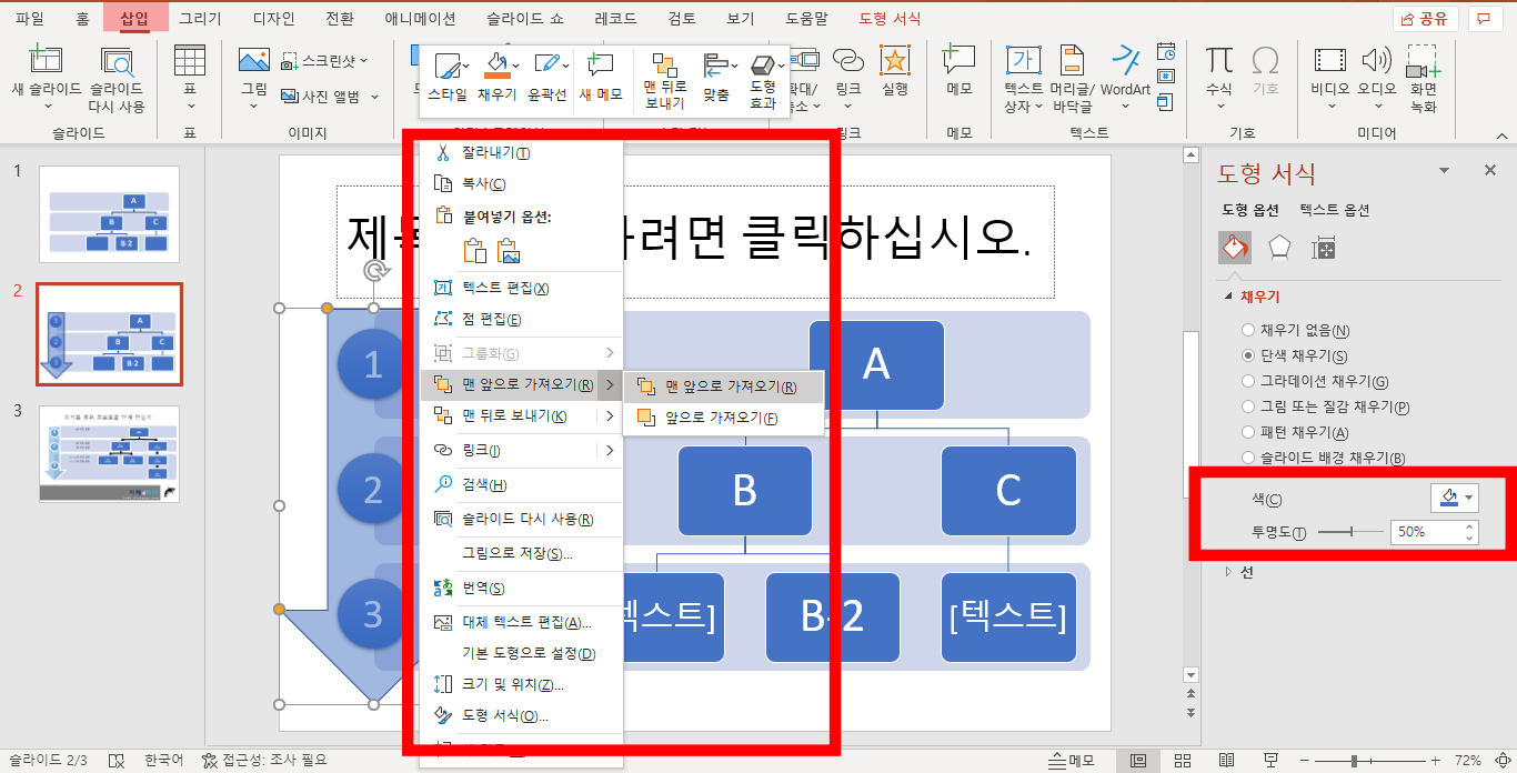 걱정하지 마시기 바랍니다. 도형을 채우고 있는 색깔 투명도를 조절하면 만들었던 숫자들이 보이게 되니까요. 또한 화살표를 선택하고 마우스 오른쪽을 누르시면 아래와 같이 맨 앞으로 가져오거나 맨 뒤로 보낼 수 있습니다. 물론 하나씩 앞으로 뒤로 보낼 수 있습니다.