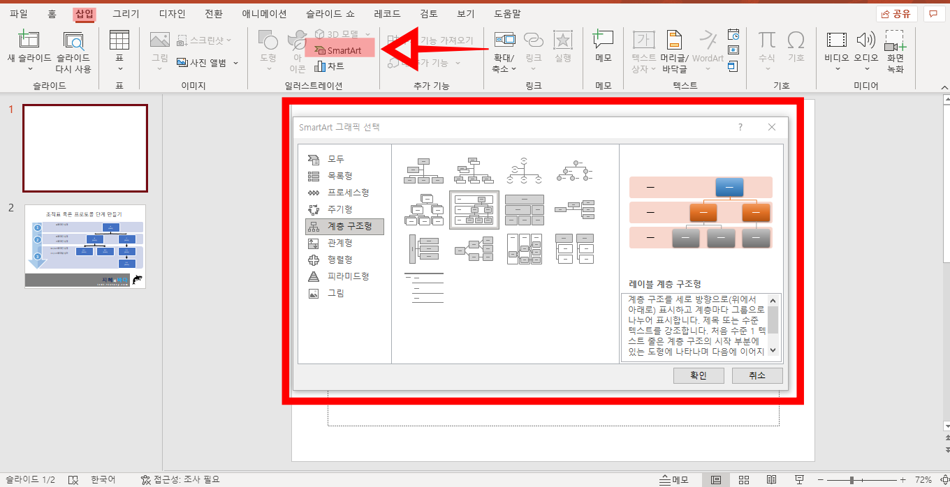 그럼 여러 모양이 나오는데 조직도는 계층 구조형으로 되어 있으니 그 중에 하나를 선택하시면 됩니다.