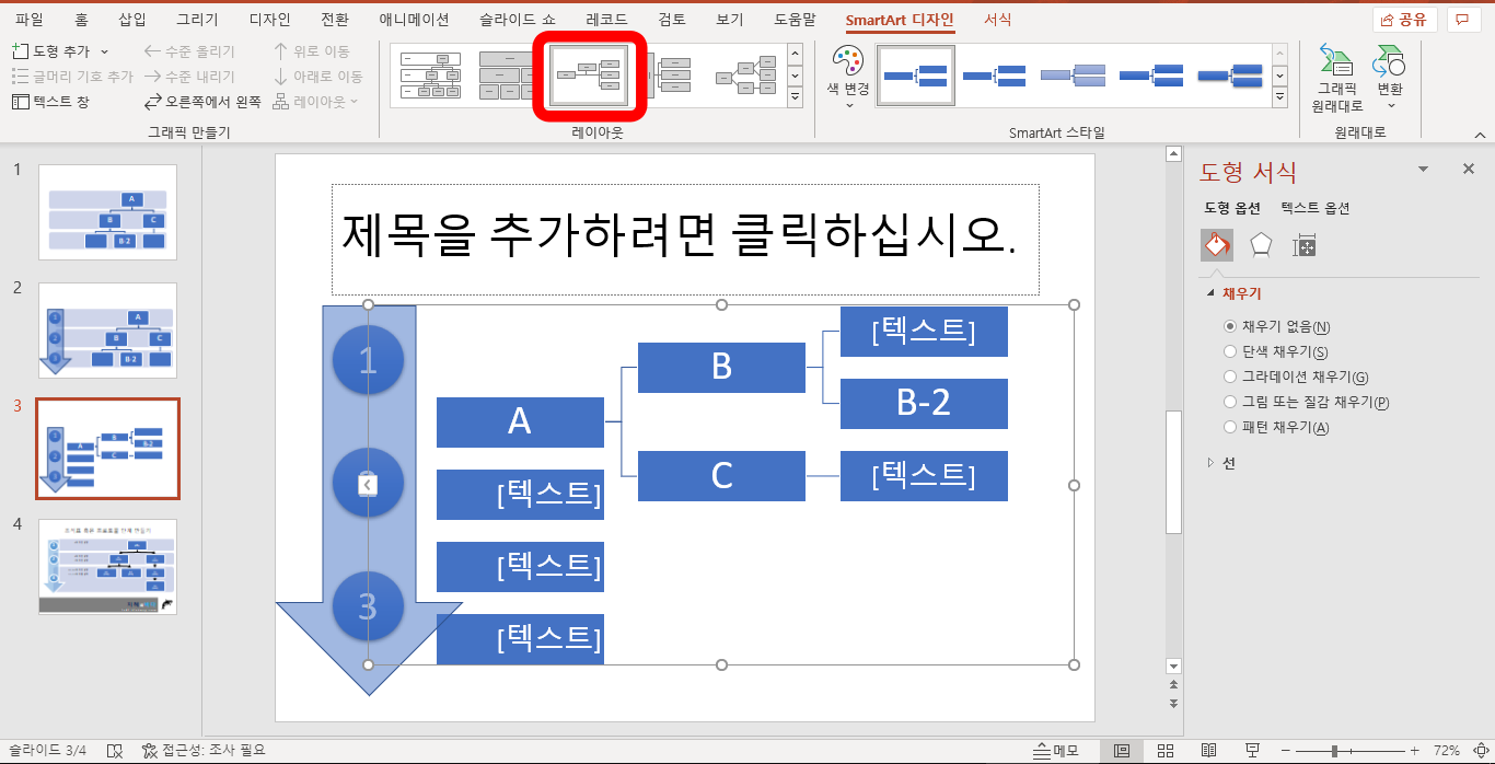 이때 크게 고민하지 않으셔도 됩니다. 스마트아트로 만들었다면 다른 모습으로 쉽게 변형이 가능하니까 말입니다. 저 같은 경우는 일단 만들어 가면서 바꾸는 스타일입니다.