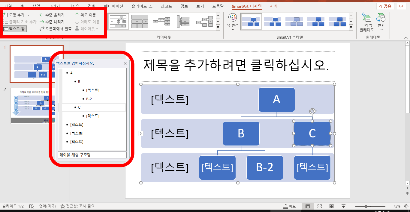 계층 구조형을 선택했다면 이제 텍스트를 입력할 수 있습니다. 이때 텍스트 창을 활성화 하셔서 작업하시면 편합니다. 도형에 마우스를 클릭해서 입력하실 필요가 없이 스스슥 입력하시면 됩니다.