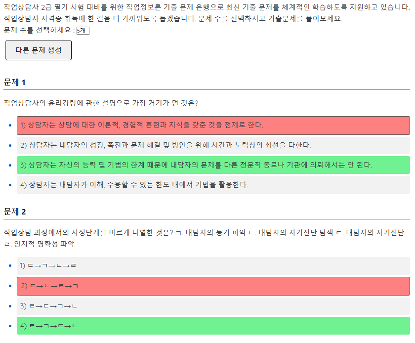 직업상담사 2급 필기 시험을 준비하는 이들을 위해 기출 문제를 학습할 수 있는 퀴즈 플랫폼을 제공하는 사이트입니다. 기존에 출제 되었던 기출 문제들을 풀어 보면서 실전 감각을 높이고, 자격증 취득을 위해 한 걸음 더 나갈 수 있ㄷ록 되어 있습니다.